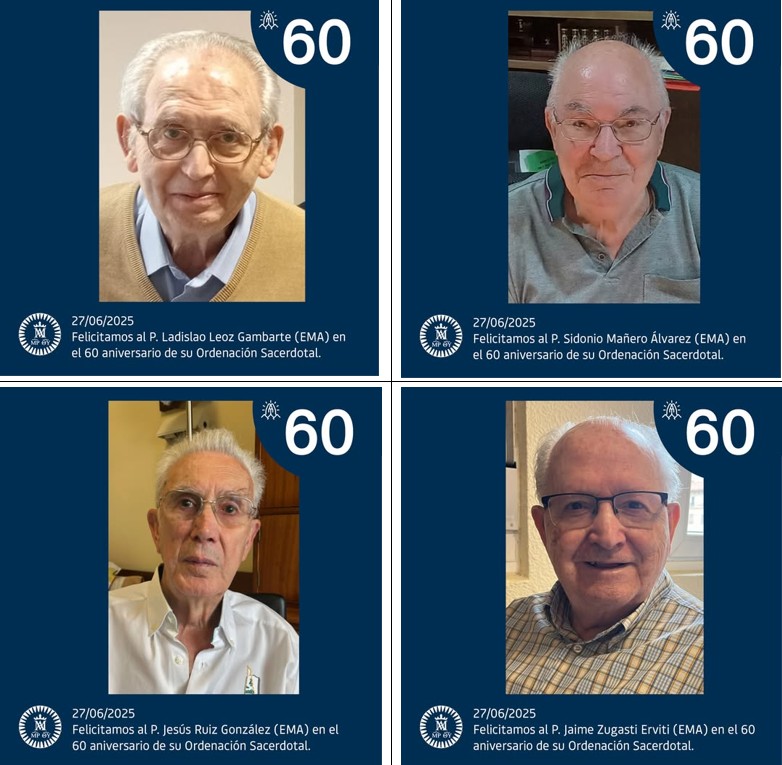 Los escolapios de Emaús, y de toda la Orden, celebran hoy los 60 años de dedicación como sacerdotes escolapios de Ladis Leoz, Sidonio Mañero, Jesús Ruiz y Jaime Zugasti: todo un signo de cómo la vocación de religiosos escolapios dedicados a la educación llena la vida y tansforma las personas y realidades.