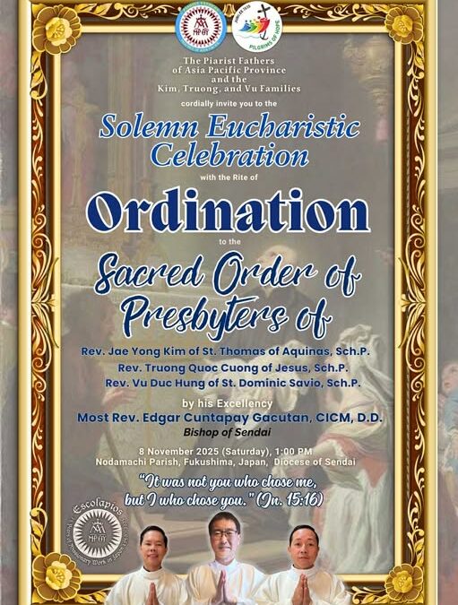 The Piarist Fathers of the Province of Asia Pacific Province joyfully announce and invite you to the Solemn Eucharistic Celebration with the Rite of Ordination to the Priesthood of our three Piarist brothers, Rev. Jae Yong Kim of St. Thomas Aquinas, Sch. P., Rev. Truong Quoc Cuong of Jesus, Sch. P., and Rev. Vu Duc Hung of St. Dominic Savio, Sch. P.