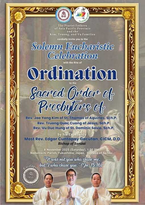 Los Padres Escolapios de la Provincia de Asia Pacífico les anuncian con alegría y les invitan a la Solemne Celebración Eucarística con el Rito de Ordenación Sacerdotal de nuestros tres hermanos Escolapios, el Rev. Jae Yong Kim de St. Tomás de Aquino, Sch. P., el Rev. Truong Quoc Cuong de Jesús, Sch. P., y el Rev. Vu Duc Hung de Santo Domingo Savio, Sch. P.