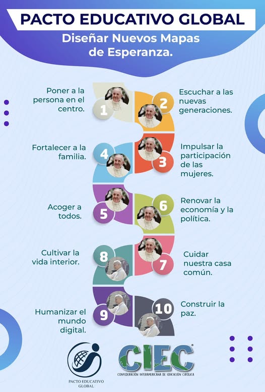 Los siete caminos del Pacto Educativo Global siguen siendo nuestra base: poner a la persona en el centro; escuchar a niños y jóvenes; promover la dignidad y plena participación de las mujeres; reconocer a la familia como primera educadora; abrirse a la acogida y la inclusión; renovar la economía y la política al servicio del hombre; cuidar la casa común.