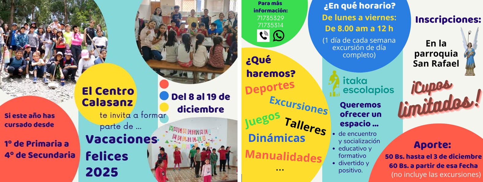 Por cuarto año consecutivo, lanzamos nuestra propuesta de Plan Vacacional, del 8 al 19 de diciembre, en el Centro Calasanz de Itaka – Escolapios en Cochabamba (Bolivia).