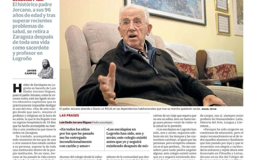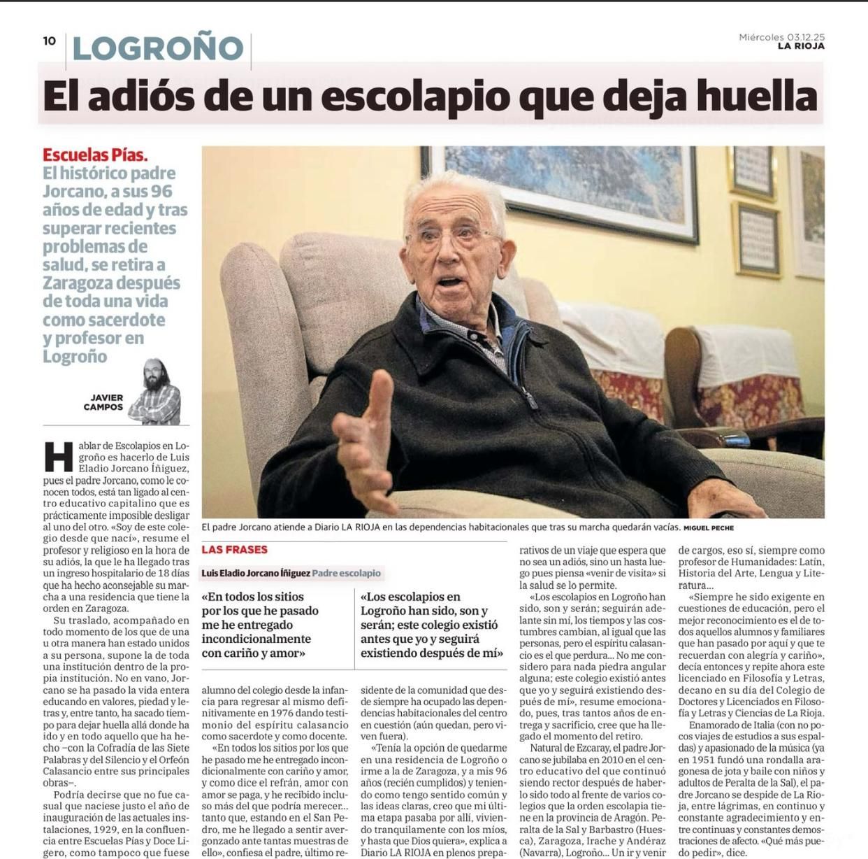 La prensa riojana publica este artículo por el escolapio Luis Jorcano que, después de toda una vida en Logroño, se retira a la residencia que tiene la Provincia de Emaús en Zaragoza para ser atendido como corresponde: es un reconocimiento público a una vida dedicada por entero a esta ciudad y sus gentes.