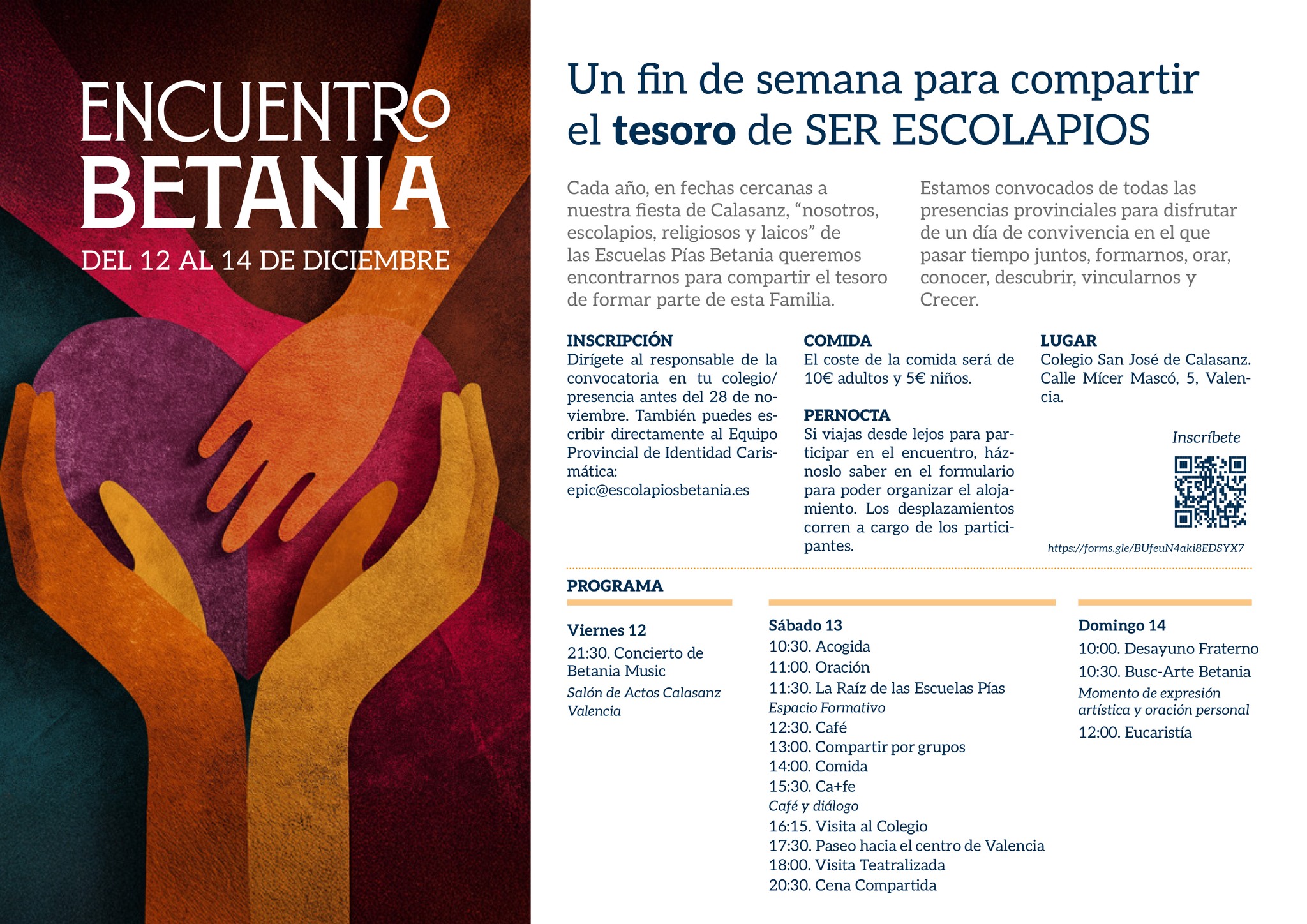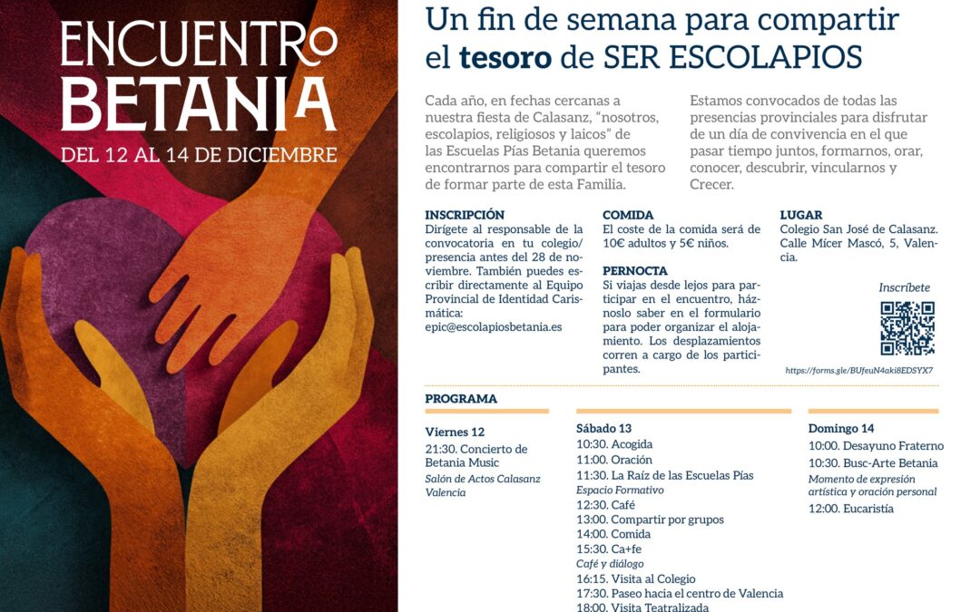 El Equipo Provincial de Identidad Carismática ha convocado el Encuentro Betania 2025, que este año celebraremos en el Colegio San José de Calasanz de Valencia, del 12 al 14 de diciembre.
