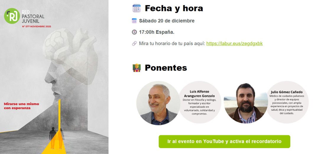 Ya tenemos un nuevo número de la Revista de Pastoral Juvenil con ese interesante título; «Mirarse uno mismo con esperanza», que podemos encontrar en https://rpj.es/wp-content/uploads/2025/12/218132_Revista_RPJ_575_Diciembre_Digital_PDF_Web_compressed.pdf