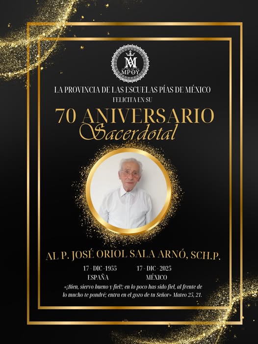 Las Escuelas Pías de México, y de todo el mundo, celebran el 70 aniversario de la ordenación sacerdotal del P. José Oriol Sala Arnó… porque ciertamente un hombre que ha dedicado tantos años de vida a servir a la misió escolapia y a la Iglesia es motivo de alegría y celebración, gracias a Dios.