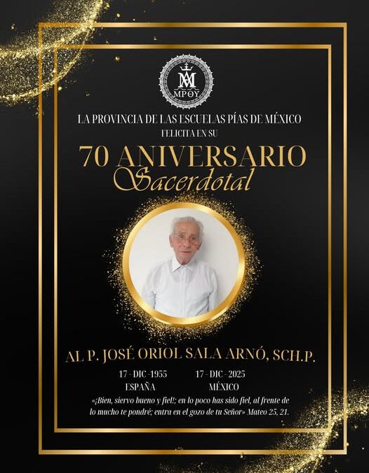 Las Escuelas Pías de México, y de todo el mundo, celebran el 70 aniversario de la ordenación sacerdotal del P. José Oriol Sala Arnó… porque ciertamente un hombre que ha dedicado tantos años de vida a servir a la misió escolapia y a la Iglesia es motivo de alegría y celebración, gracias a Dios.