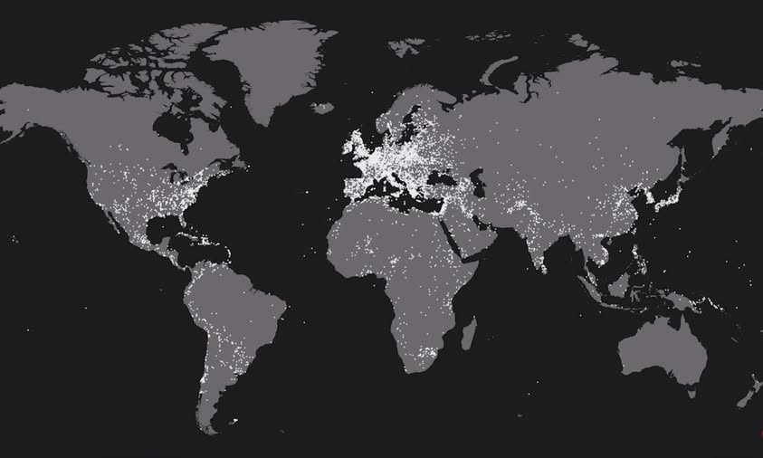 Mapa de todas las batallas que han tenido lugar desde el año 2500 a.C. y que tienen registro en Wikipedia (son unas 10.624 batallas).
