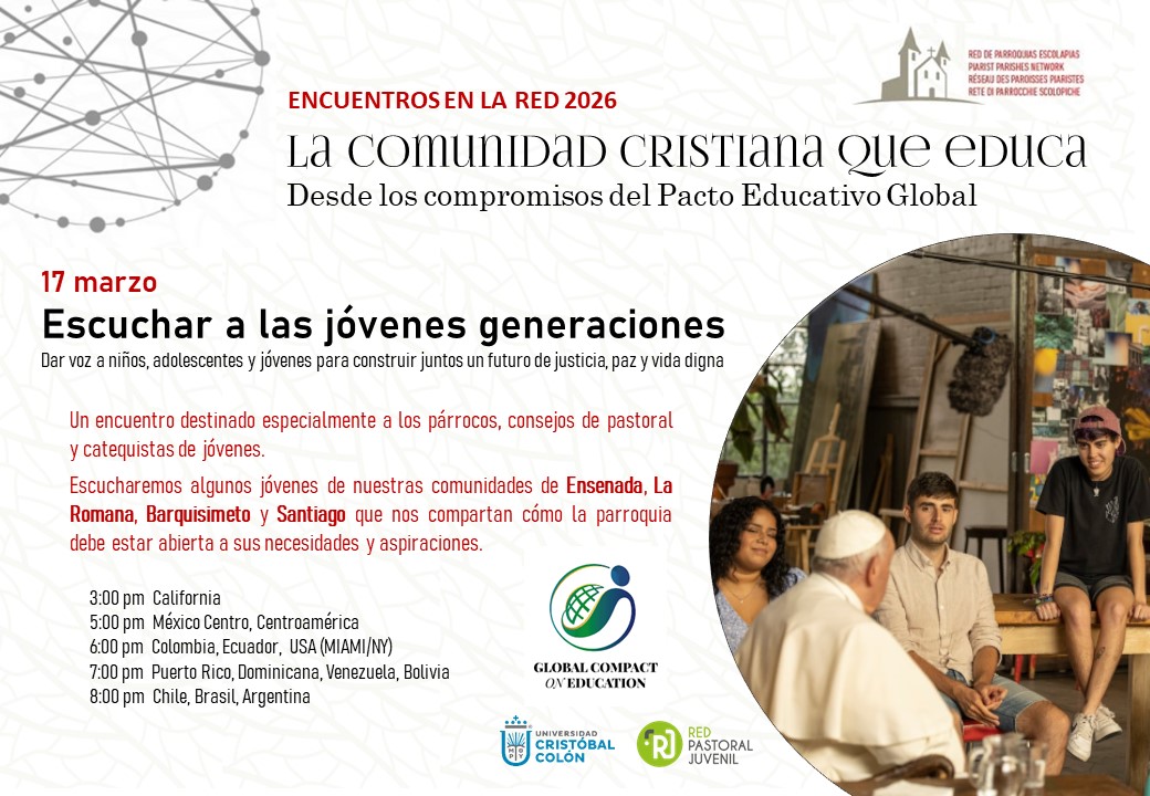 Uno de los compromisos del Pacto educativo Global es escuchar a las jóvenes generaciones. En el encuentro del 17 de marzo escucharemos la voz de algunos jóvenes de nuestras parroquias que seguramente nos ayudará a mejorar nuestra propuesta pastoral. Todos están invitados, pero de un modo especial los catequistas y educadores de nuestras comunidades.