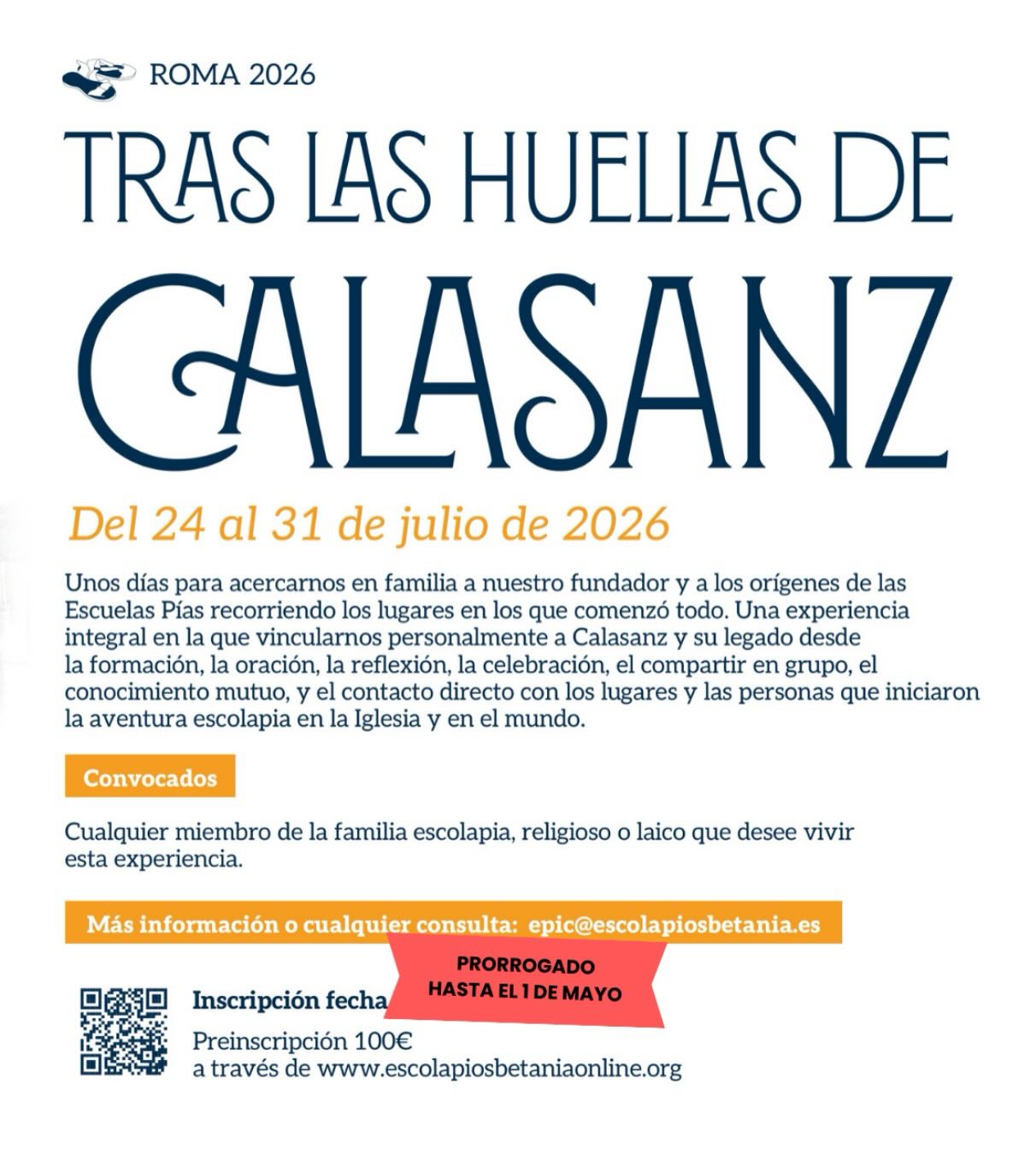 EXPERIENCIA CON LOS ESCOLAPIOS DE BETANIA 18/03/2026 TRAS LAS HUELLAS DE CALASANZ | ROMA 2026 Del 24 al 31 de julio Una experiencia para volver al origen. 750€ adultos | 550€ menores Preinscripción: 100€ Hasta el 1 de mayo epic@escolapiosbetania.es