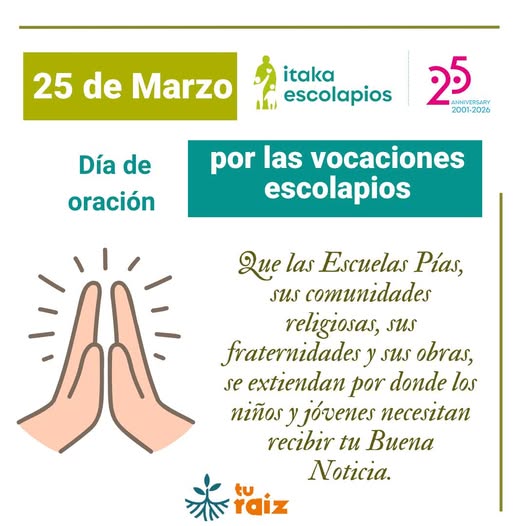 Por todo ello es un buen día para orar por las vocaciones escolapias. Seguimos necesitando nuevos escolapios para atender a tantos niños, jóvenes, personas necesitadas a las que dedicamos nuestra vida escolapia.