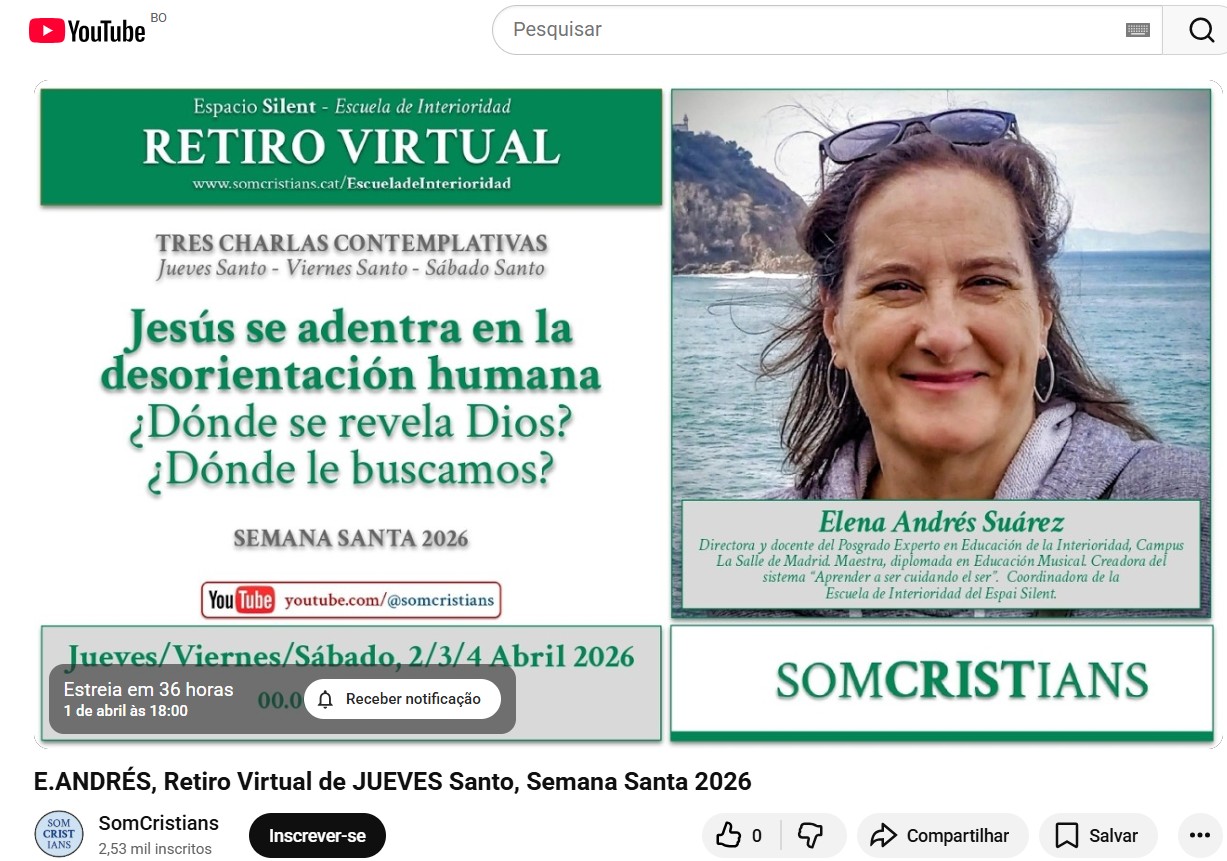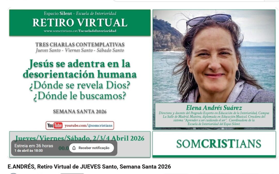 Somcristians ofrece para esta Semana Santa 2026 un retiro virtual con Elena Andrés, coordinadora de la recién creada Escuela de Interioridad del Espacio Silent. Una valiosa propuesta de tres sesiones online para cada uno de los días santos (Jueves Santo, Viernes Santo y Sábado Santo), consistente en una charla, un espacio de contemplación y momentos personales para la oración y meditación.