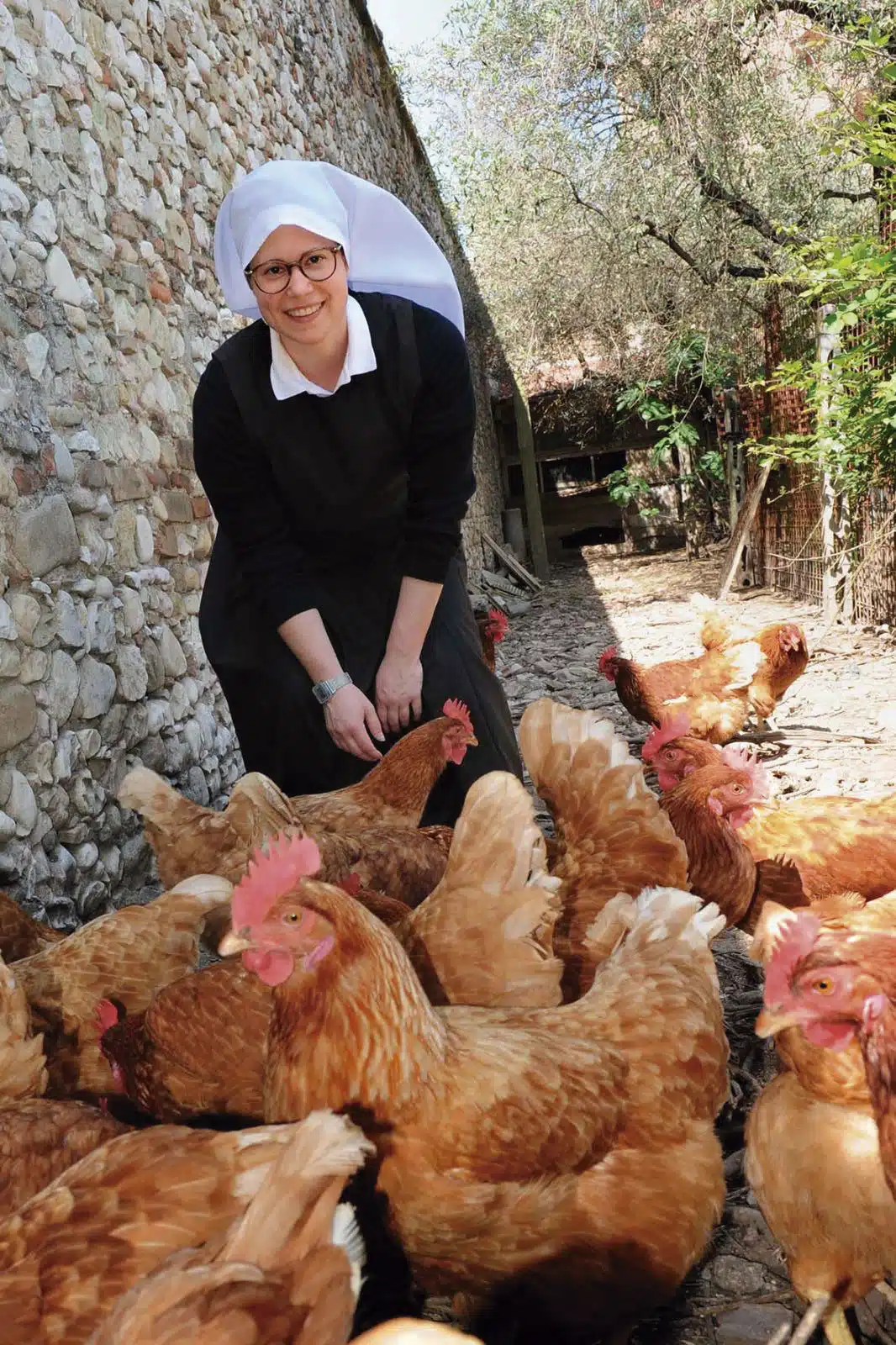 La hermana Myriam D’Agostino, maestra de novicias de 41 años, napolitana y licenciada en filosofía, carga dos palés de comida en la camioneta y los traslada al claustro. Alrededor de las cuatro, después de la sexta hora, el almuerzo y la oración de nona, las monjas se vuelven a congregar en la cocina. Se les unen algunas huéspedes como Alessandra, quien está terminando sus estudios y reside en el monasterio. Al mismo tiempo, desde una entrada lateral, la hermana María Eletta y la hermana Rémy ya están distribuyendo los paquetes de alimentos a las familias necesitadas del pueblo. Este servicio se gestiona en colaboración con el Banco de Alimentos, Cáritas y una gran cadena de supermercados.